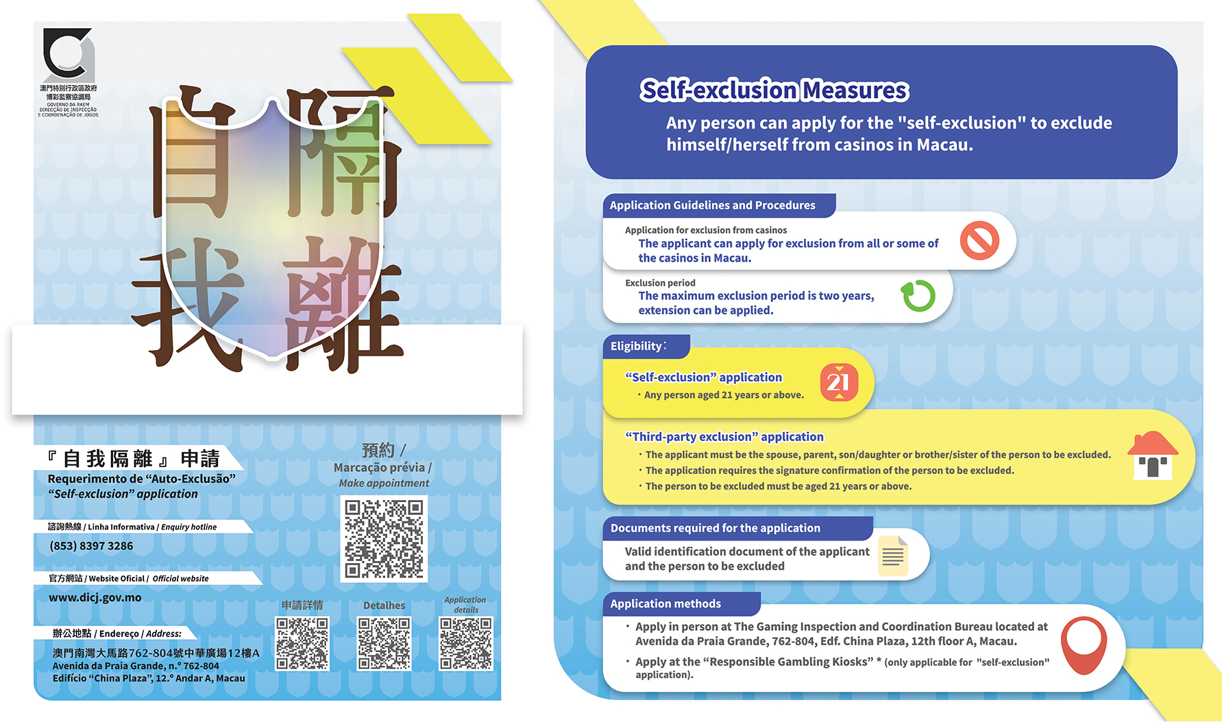 A Responsible Gambling Kiosk or Station is available at every GEG casino. Co-owned by IAS, DICJ and ISCG, this facility is engineered to, through digital and gamified interactions, provide customers with essential information about responsible gaming and gambling addiction prevention such as definition of gambling, house advantages, myths of gambling, rules of games, assessment of gambling addition, and contact information of problem gambling treatment centers, etc. It also connects customers to a 24-hour hotline service, and an electronic application for self-exclusion for both residents and tourists.