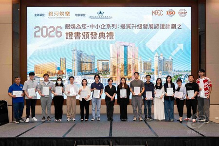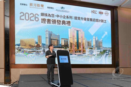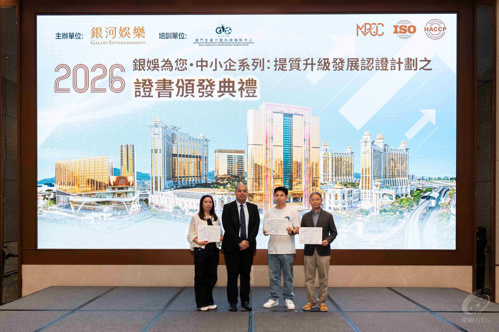 April 29, 2026 – As the first integrated tourism and leisure enterprise in Macau to promote “Large Businesses Leading Small Businesses” business model, Galaxy Entertainment Group (“GEG”) has actively supported local SMEs through a range of diversified initiatives to foster their sustainable development. Since 2024, GEG has launched the “GEG SME Series: Quality Enhancement Certification Program” to support eligible local suppliers in completing management system training courses offered by the Macau Productivity and Technology Transfer Center (“CPTTM”) over two consecutive years. The program enables participating enterprises to obtain the “M-Mark” Macau Product Quality Certification (“‘M-Mark’ Certification”) and other professional qualifications. Recently, GEG held the second Certificate Award Ceremony at the Galaxy International Convention Center to recognize nearly 40 suppliers who successfully attained their certifications. The event attracted over 80 representatives from GEG suppliers and featured multiple exhibition booths to facilitate further exchange and collaboration between suppliers and GEG’s procurement team.