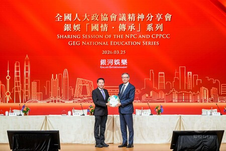 2026年3月25日 — 銀河娛樂集團(下稱「銀娛」)背靠祖國、植根澳門,多年來積極透過多元舉措向團隊成員、本澳青少年及社區不同群體傳遞愛國愛澳核心價值。今日,銀娛於銀河國際會議中心之銀河演講廳舉辦年度「全國人大政協會議精神分享會 — 銀娛『國情‧傳承』系列」(下稱「分享會」),邀請全國政協常委、澳門立法會副主席何潤生先生;全國人大代表、澳門立法會議員何敬麟先生;以及全國政協委員、銀娛主席呂耀東先生擔任主講嘉賓;並獲中央人民政府駐澳門特別行政區聯絡辦公室(下稱「中聯辦」)經濟部處長孫耀華先生出席支持,以及澳門大學博彩研究所所長馮家超先生擔任分享會主持人。分享會結合線上及線下形式,向來自澳門、香港、橫琴、深圳、廣州、華東、華北及雲南的逾800名嘉華集團、銀娛以及銀娛旗下嘉華建材管理層成員,傳達「兩會」精神;相關精華影片亦將於旗下各物業後勤區播放,讓逾20,000名團隊成員同步學習。此外,銀娛首次邀請「銀娛澳門盃—青少年國情知識競賽」的參賽師生一同出席,並作為第18屆競賽的首項活動,加深學生對國家發展大局及國情脈絡的認識。