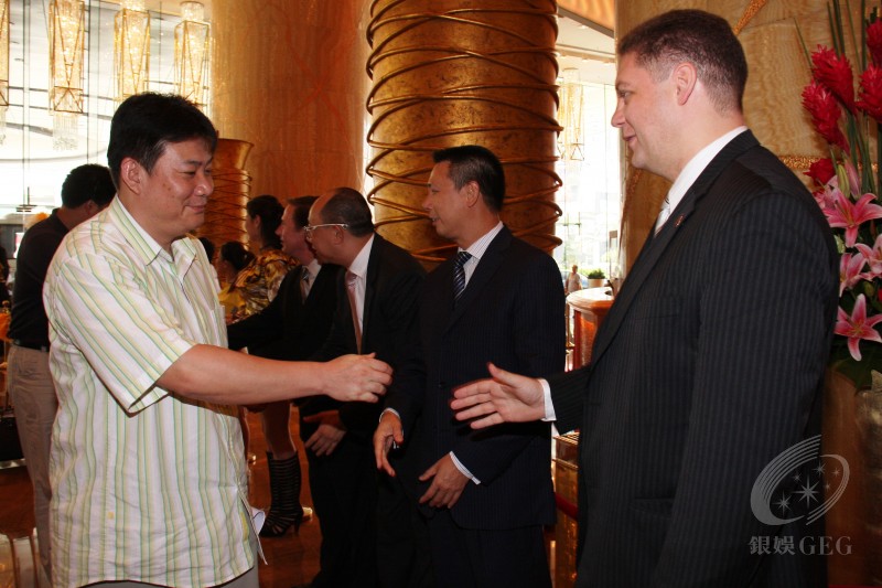 星际酒店营运总裁简浩龙先生(右)等领导层在星际酒店欢接以新任主教练蔡斌(左)为首的中国女排全体成员。