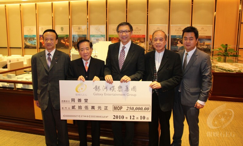 「澳门同善堂」主席许世元先生(左二)丶监事长李汉基先生(右二)和副监事长刘艺良先生(左一)丶银娱副主席吕耀东先生(中)及公共关系副总裁林志成先生(右一)一同出席於「澳门银河™」展览中心举行之支票送赠仪式。