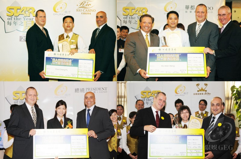 銀河娛樂集團城市娛樂會「08年度之星」得獎員工—利澳蔡清波(左上)、華都區文興(右上)、總統馬倩儀(左下)和金都文燕儀(右下)與集團管理層於頒獎典禮上合照