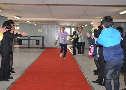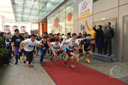 來自星際酒店十多個部門、合共約一百名員工報名參加,他們於早上九時前已齊集在星際 酒店員工入口的起跑點熱身,為賽事做好準備。比賽由銀河娛樂集團人力資源及行政集團 董事呂慧玲女士以及星際酒店及娛樂場營運董事蘇澤霖先生負責為起跑嗚槍,槍聲一發, 眾人都一湧而上,爭取最有利的位置向三十六樓的終點進發。
